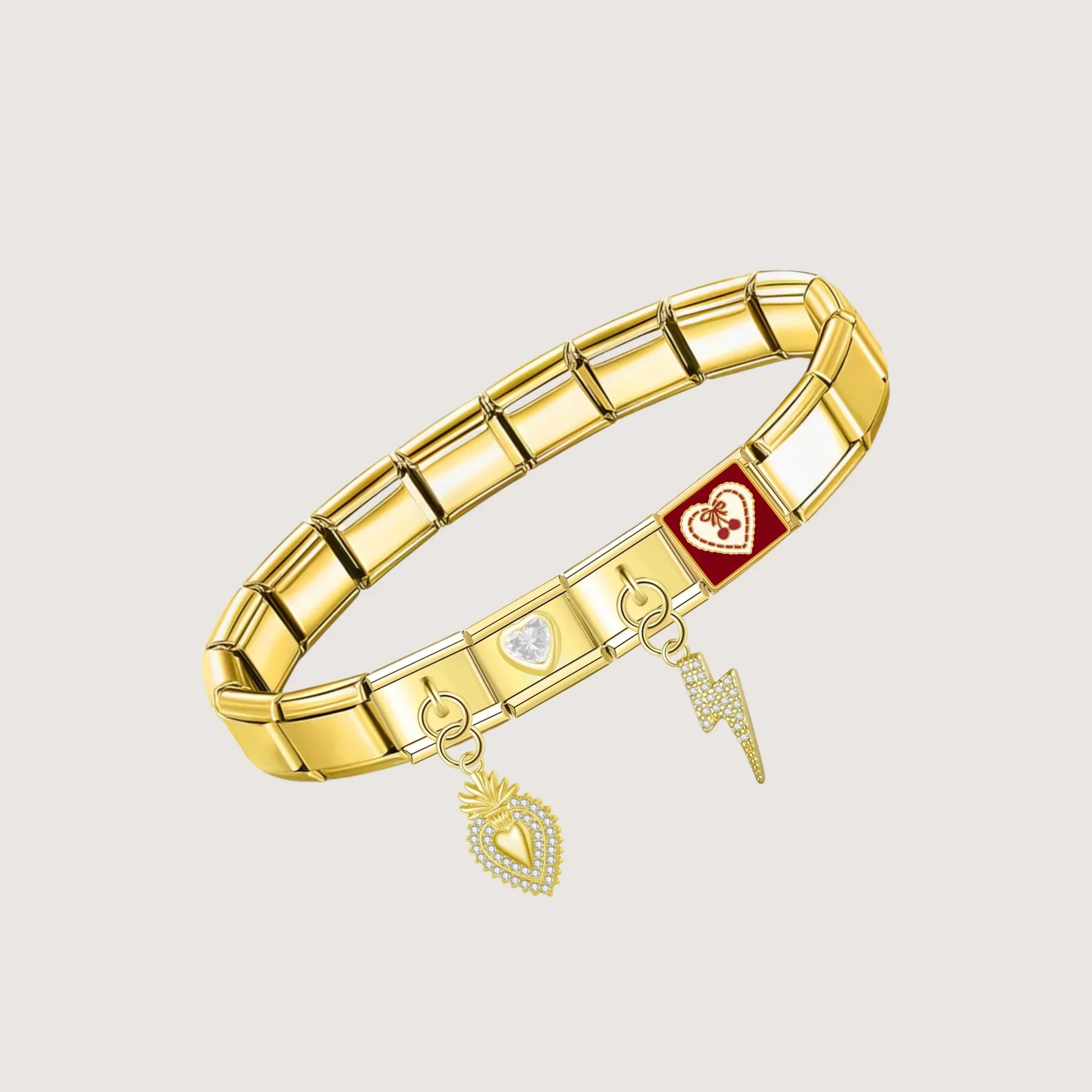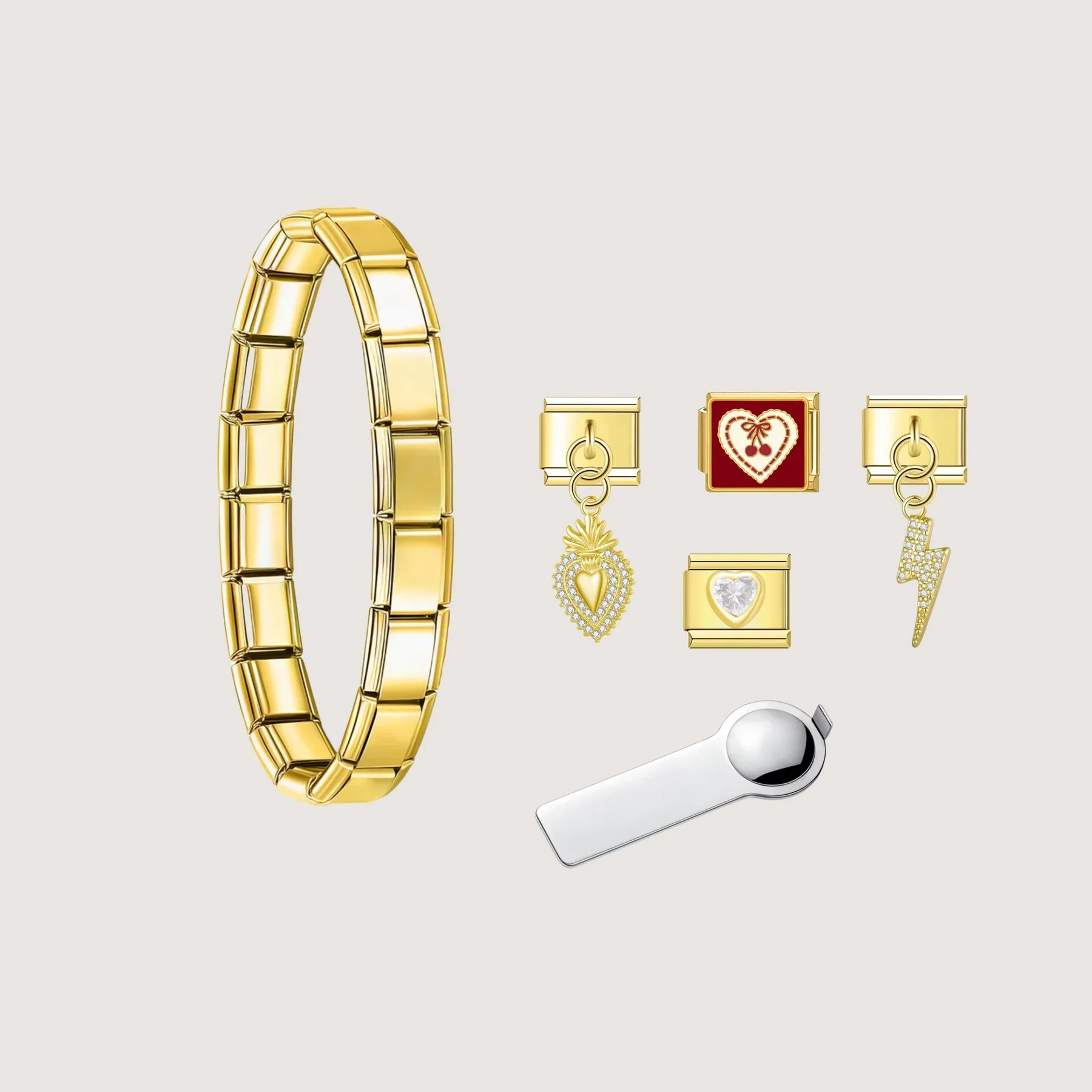 התחילו עם צמיד חלק והוסיפו כמה צ׳ארמים, תוך התאמת המידה על ידי הסרת חוליות.